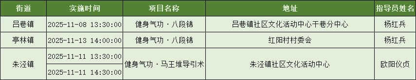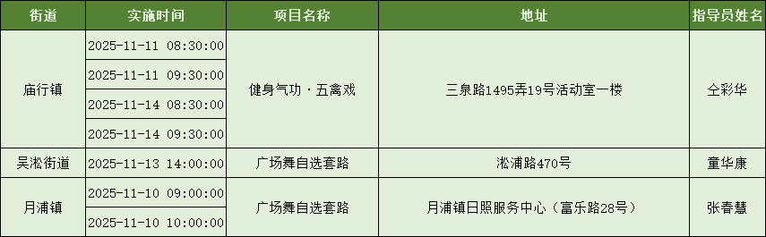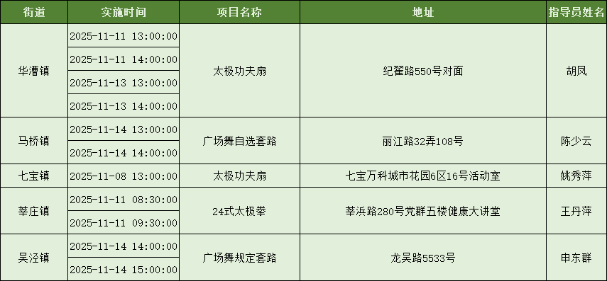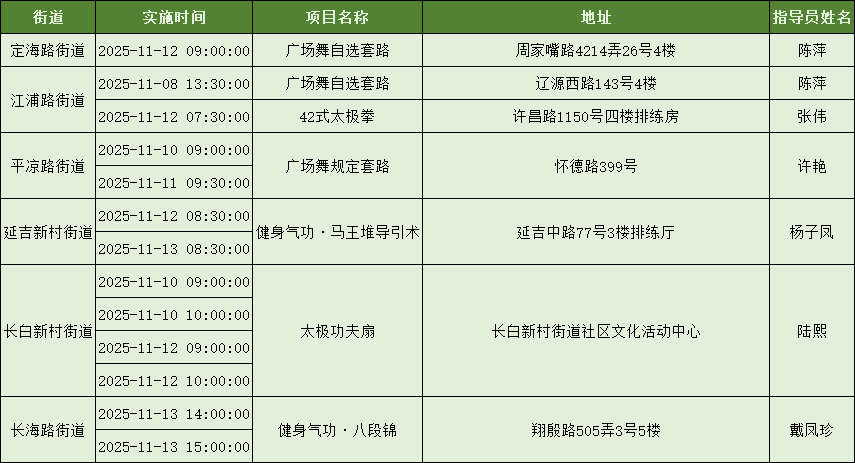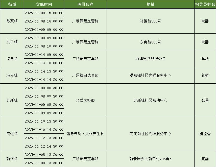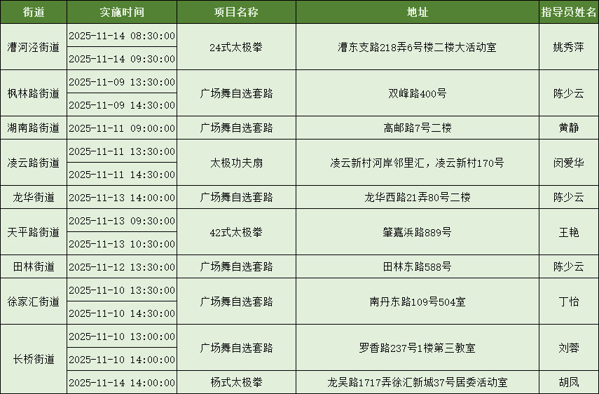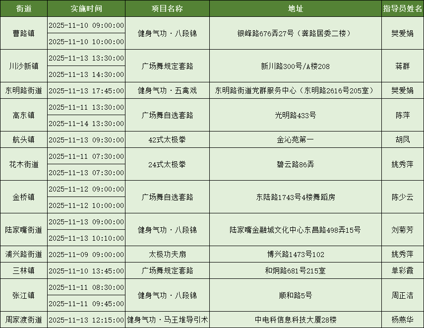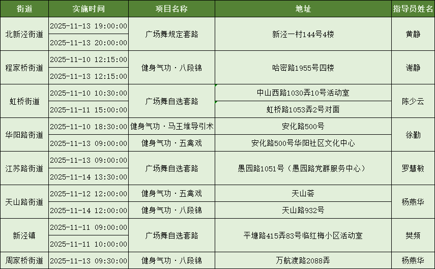 为加强科学健身指导服务、努力打造市民满意的“15分钟社区体育生活圈”,上海市社区体育协会发动各项目社会体育指导员,携手各区各街镇广泛开展社区体育配送服务,提升社区居民就近享有公共体育服务的感受度。下面是11月8日到11月14日的配送一览表,快来看看你的街镇有什么课程吧~