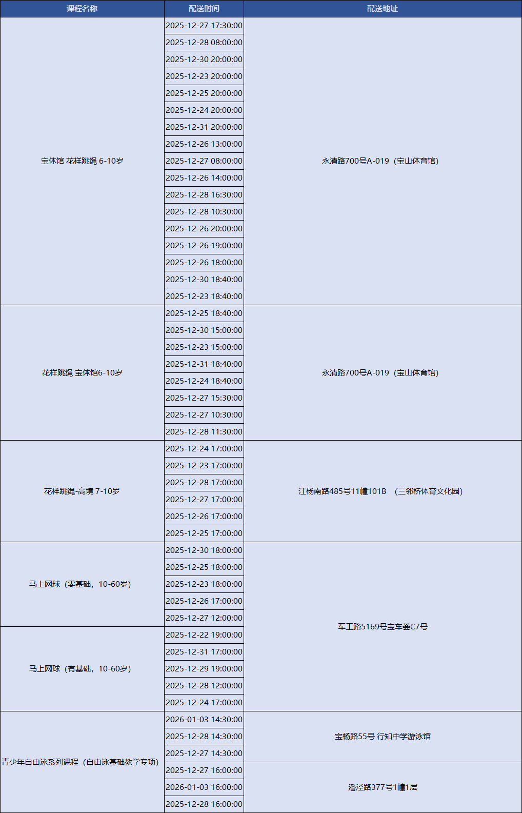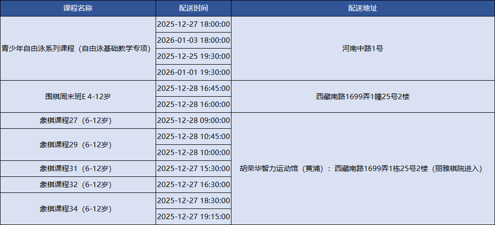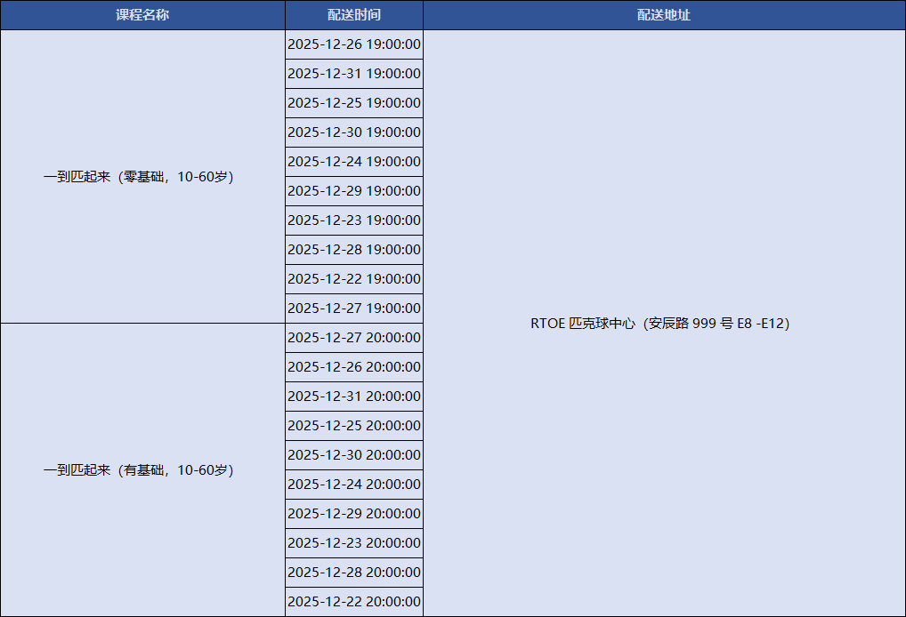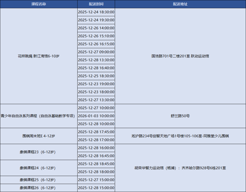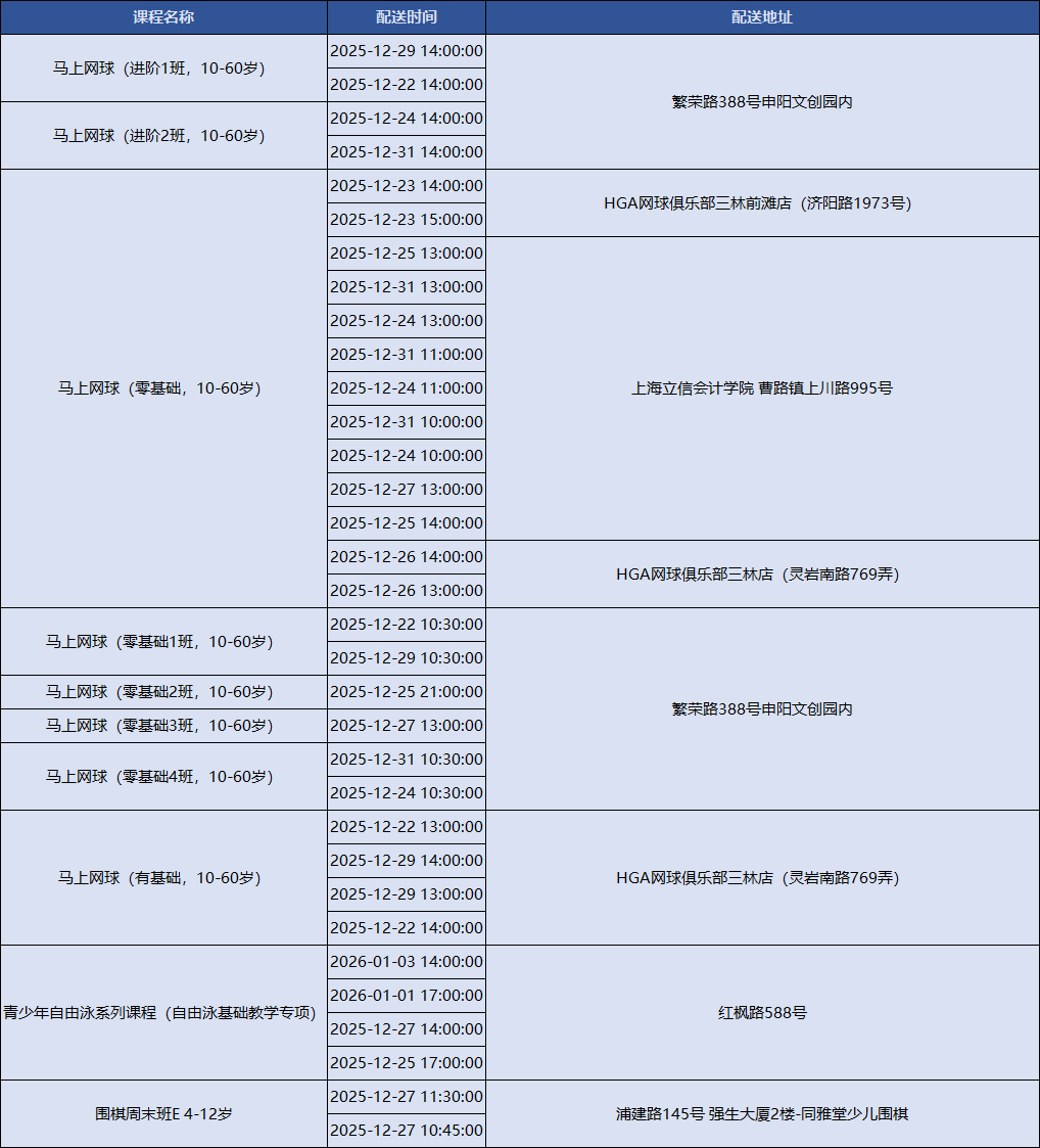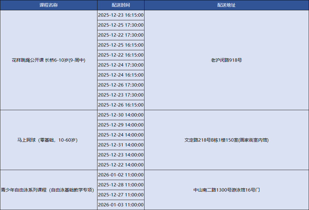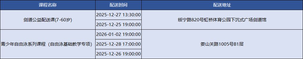 上海积极响应国家号召,持续创新配送服务模式,努力为市民提供更加均衡、可及、优质的全民健身服务配送。上海市体育局联合各市级单项体育协会组织开展全民健身公共服务配送站点创建工作,新一轮上海市全民健身公共服务配送线上报名已正式上线!下面是2025年12月22日到2026年1月5日的课程一览表,快来看看吧~
