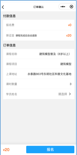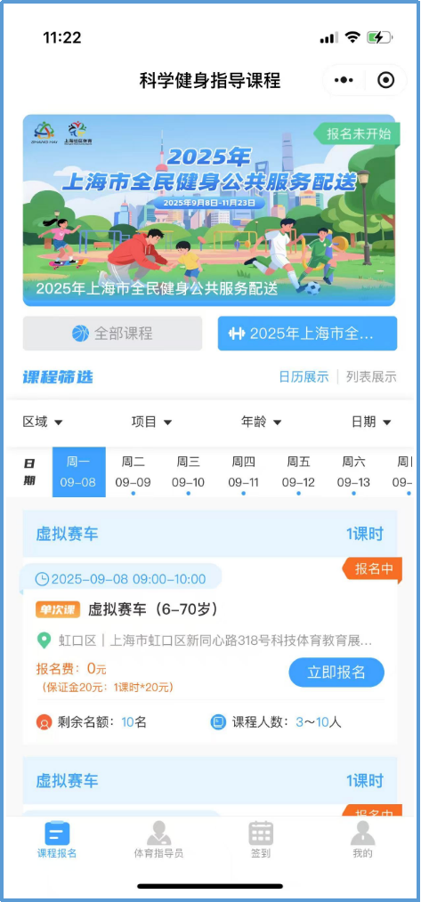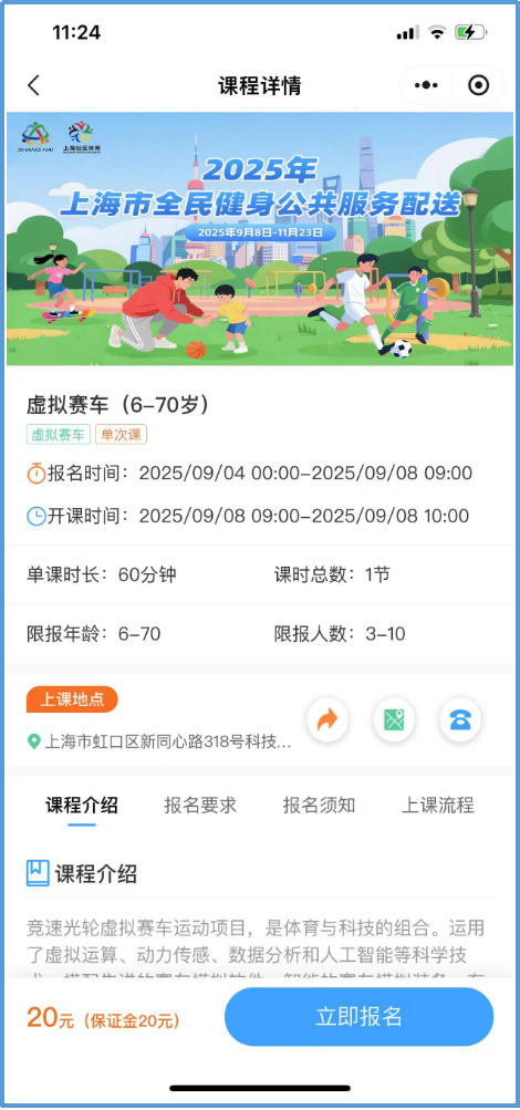 进入“上海社会体育指导员”微信小程序,即可直接进入活动链接,选择开课日期查看课程安排,点击“报名”按钮查看课程详细信息,添加选择学员信息,支付保证金完成报名(为确保授课质量,此次报名每次课程每课时收取20元保证金,提前24小时,部分课程提前12小时取消报名或完成上课打卡即可退还)。