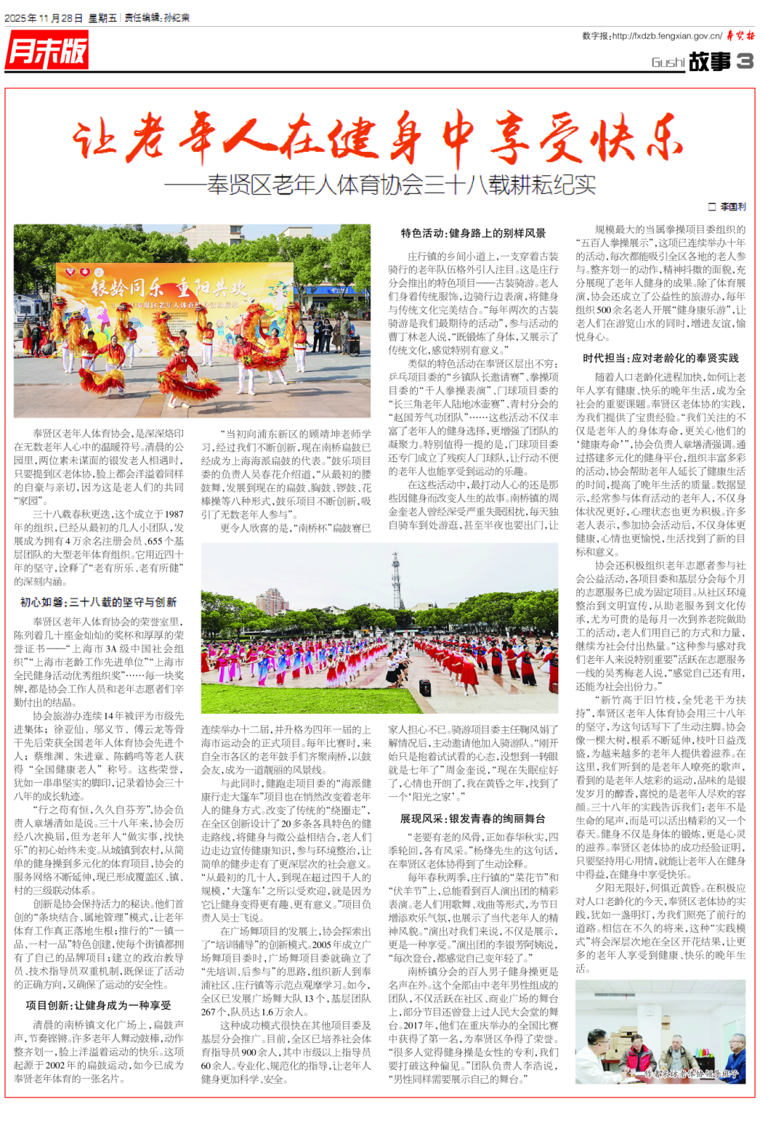 “新竹高于旧竹枝,全凭老干为扶持”,奉贤区老年人体育协会用三十八年的坚守,为这句话写下了生动注脚。协会像一棵大树,根系不断延伸,枝叶日益茂盛,为越来越多的老年人提供着滋养。在这里,我们听到的是老年人嘹亮的歌声,看到的是老年人炫彩的运动,品味的是银发岁月的醇香,喜悦的是老年人尽欢的容颜。三十八年的实践告诉我们:老年不是生命的尾声,而是可以活出精彩的又一个春天。健身不仅是身体的锻炼,更是心灵的滋养。奉贤区老体协的成功经验证明,只要坚持用心用情,就能让老年人在健身中得益,在健身中享受快乐。