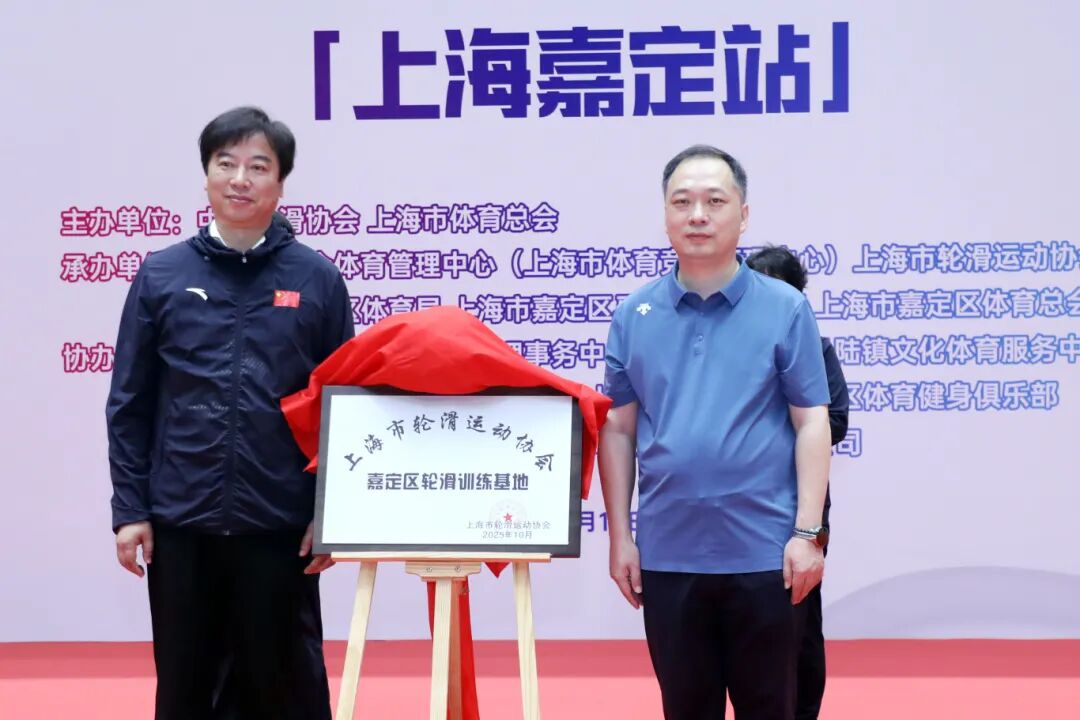当天,嘉定区体育局党组书记、局长周万春和中国轮滑协会执委、上海市轮滑运动协会会长顾卫峰共同为嘉定区轮滑训练基地揭牌。