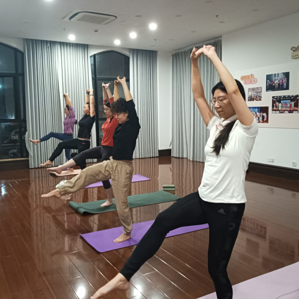 在练习过程中,教练不断提醒学员们要专注于自身的身体感受,用心体会每一个动作带来的肌肉拉伸和放松。当大家逐渐适应了这些基础动作后,教练又增加了一些具有挑战性的进阶体式,如三角伸展式和战士二式,进一步提升学员们的身体柔韧性和力量。学员们全神贯注地跟随教练的节奏,认真完成每一个动作,尽管有些动作难度较大,但大家都努力坚持。整个教室里弥漫着专注和积极向上的氛围,学员们在挥洒汗水的同时,也释放着工作中的压力。课程接近尾声时,教练带领大家进行了深度的放松冥想,让学员们在安静的氛围中彻底放松身心,仿佛所有的疲惫和烦恼都随着呼吸被排出体外。
