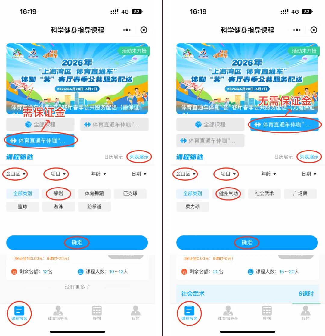 即日起至4月19日0时,扫描上方小程序码即可直接进入报名,市民可分别选择两大类项目课程(“需保证金”和“无需保证金”),课程筛选为“列表展示”,区域选择“金山区”,选择感兴趣的项目查看课程信息,符合报名条件者均可进行报名,添加选择学员信息,支付保证金(若有)完成报名。