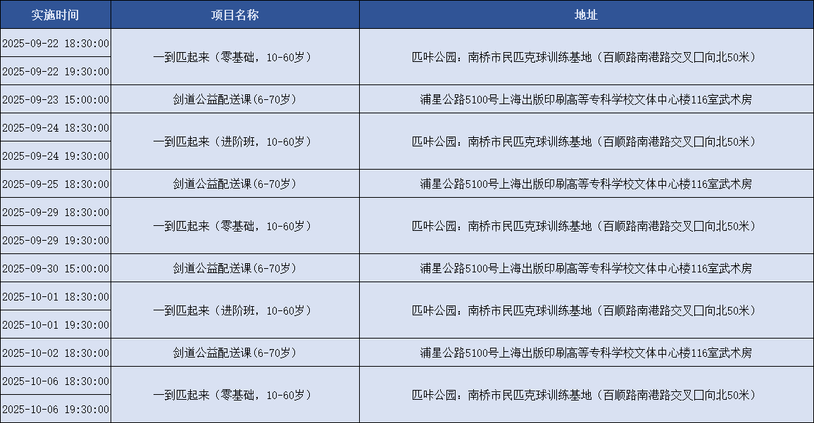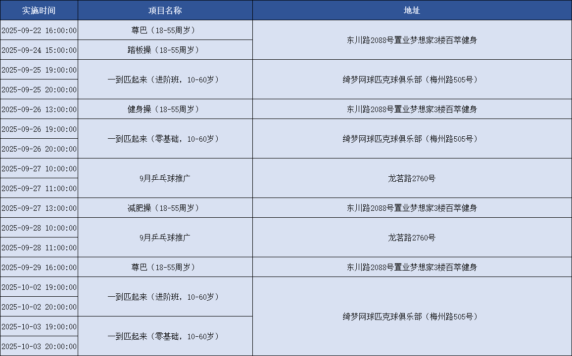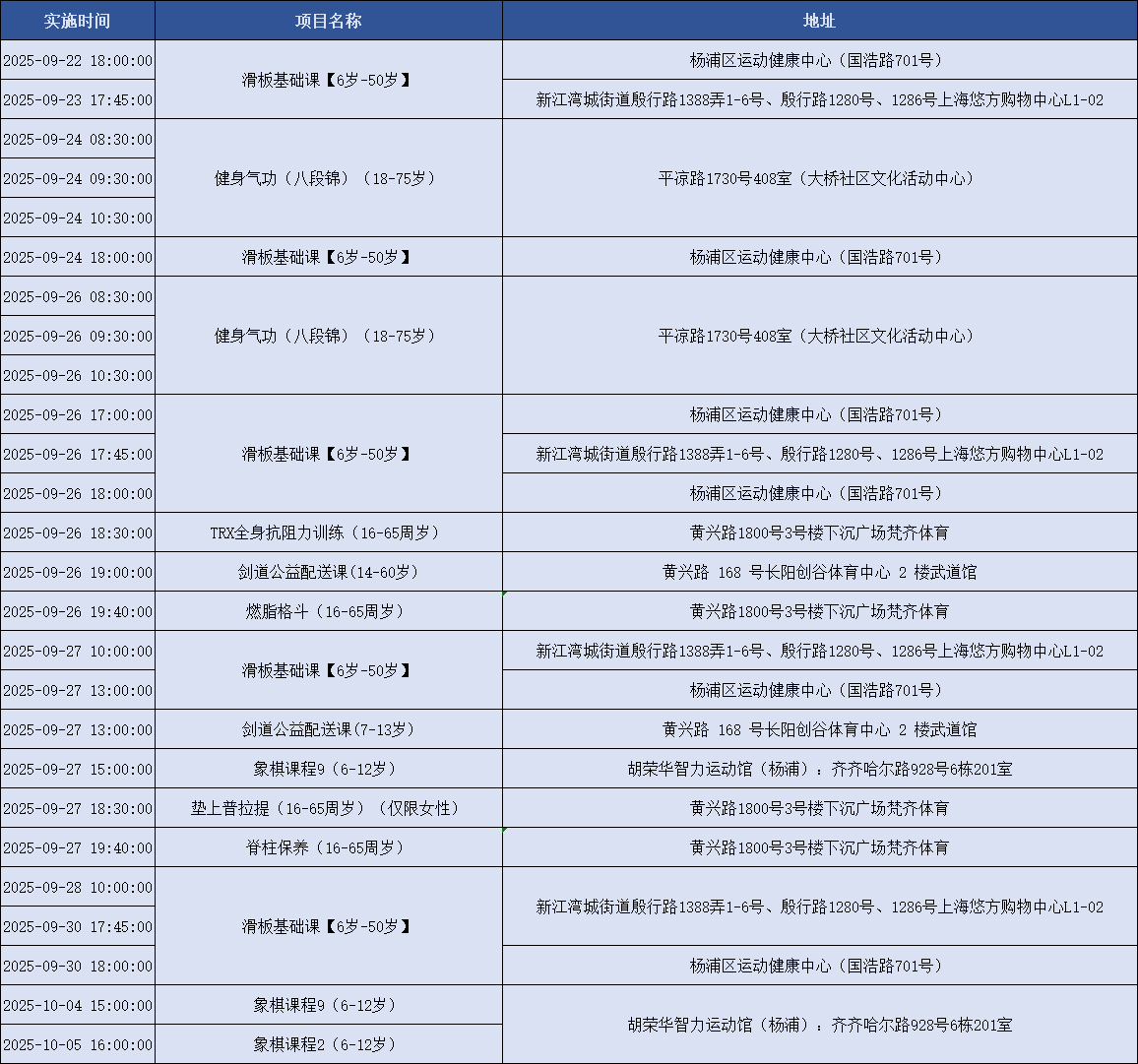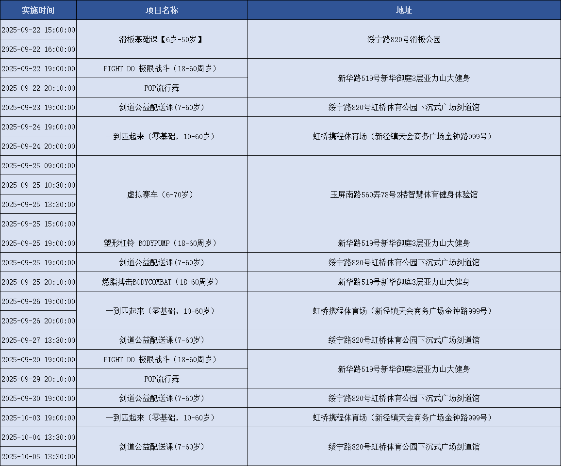 上海积极响应国家号召,持续创新配送服务模式,努力为市民提供更加均衡、可及、优质的全民健身服务配送。上海市体育局联合各市级单项体育协会组织开展全民健身公共服务配送站点创建工作,新一轮上海市全民健身公共服务配送线上报名已正式上线!下面是9月22日到10月6日的课程一览表,快来看看吧~