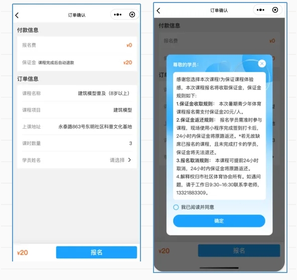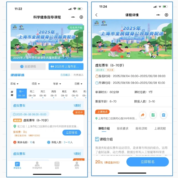 点击小程序链接进入“上海社会体育指导员”微信小程序,即可直接进入活动链接,选择开课日期查看课程安排,点击“报名”按钮查看课程详细信息,添加选择学员信息,支付保证金完成报名(为确保授课质量,此次报名每次课程每课时收取20元保证金,提前24小时(部分课程提前12小时)取消报名或完成上课打卡即可退还)。