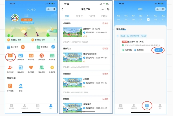 报名成功后,可通过“我的”—“课程订单”,查看课程报名信息。可通过“签到”页面查看待上课安排。