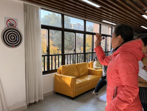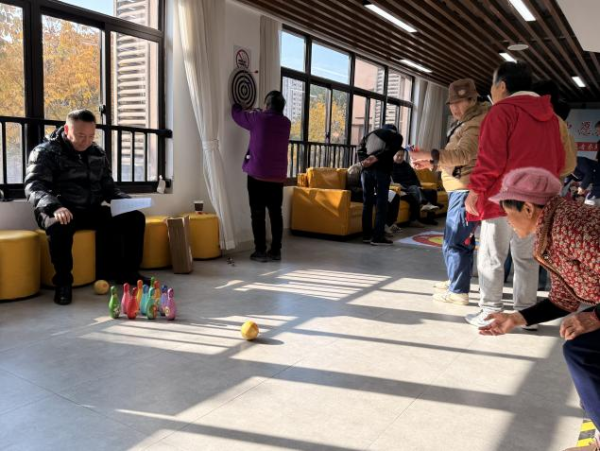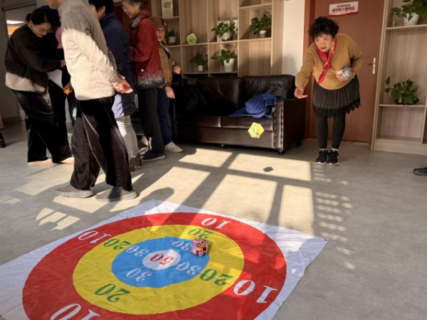 飞镖区前,居民们排着队摩拳擦掌,瞄准镖靶用心投掷,欢呼声、惋惜声此起彼伏;趣味投壶区域,居民们踮着脚尖认真投箭,旁边的志愿者加油鼓励,互动温馨十足;保龄球区域,大家沉稳专注,不甘示弱,现场氛围热烈又和谐;沙包区域,更是人头攒动,志愿者协助计分,每个人脸上都洋溢着喜悦。