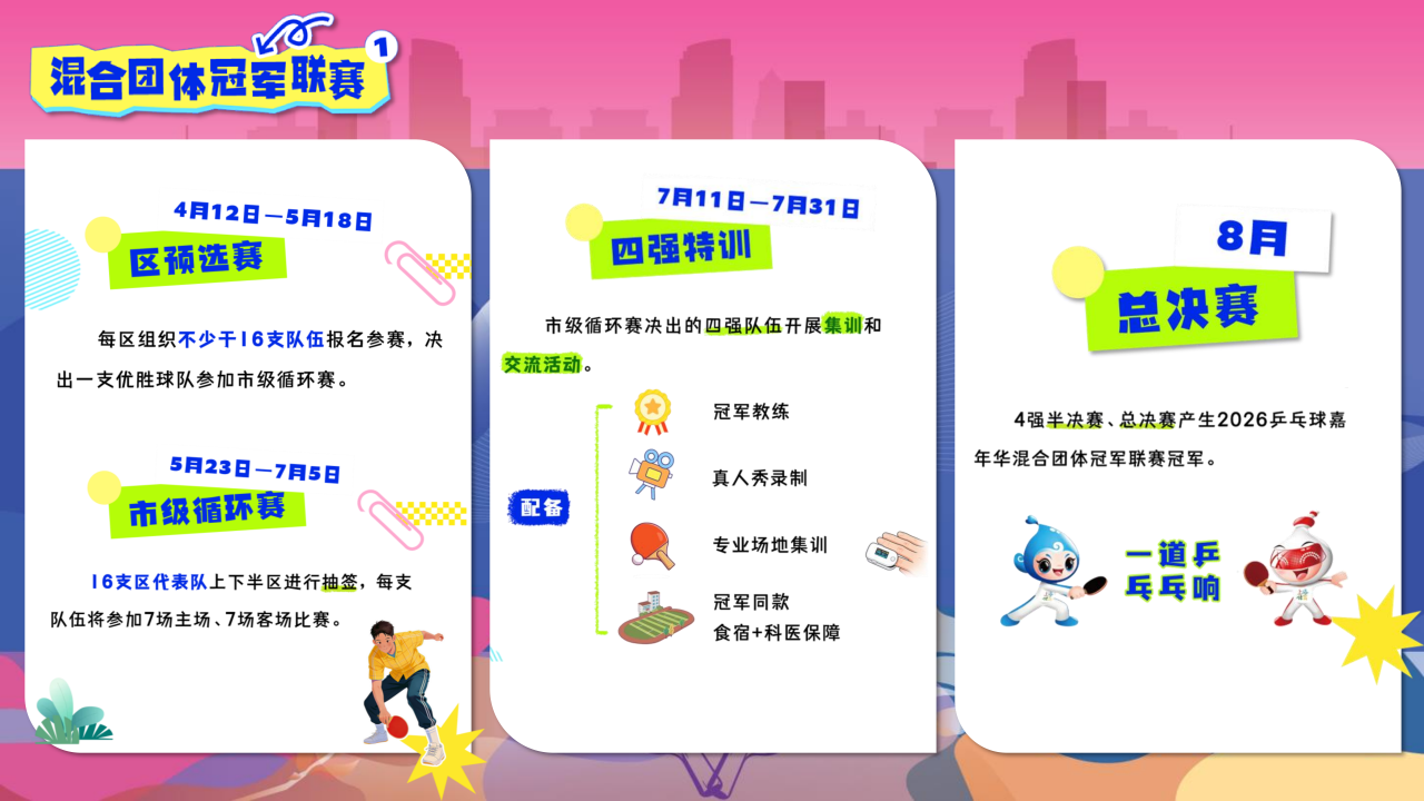 2026上海乒乓球嘉年华活动恰逢中美“乒乓外交”55周年、国际乒联成立与世乒赛举办双百年历史节点。嘉年华活动将持续至今年8月,比赛活动遍布全市体育场馆、文化地标、办公楼宇、商业空间、旅游景点等,既有专业赛事比拼,也有全民趣味互动,让“乓乓响”的激情热潮涌动全城,推动国球精神与海派文化深度融合。其中,专业赛事分为混合团体冠军联赛、城市个人冠军赛两大板块。未来4个月,16支区队将通过主客场双循环赛展开激烈角逐,争夺四强总决赛席位。民间乒乓高手同台竞技,充分展现上海全民乒乓的活力与风采。