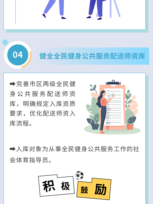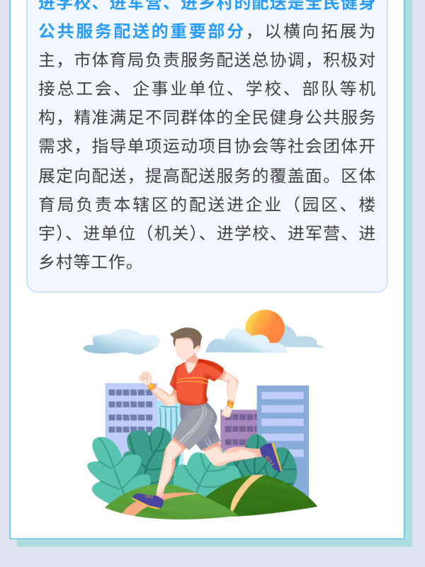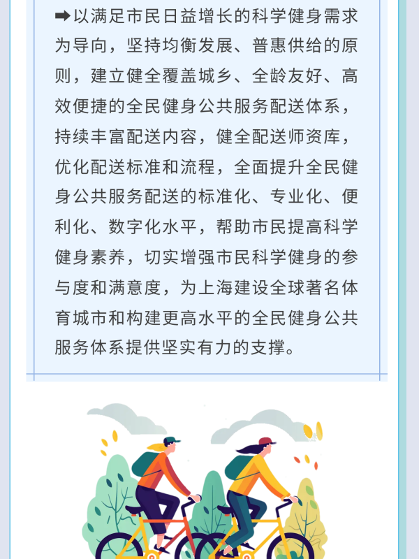 为构建更高水平的全民健身公共服务体系建设,满足市民日益增长的科学健身需求,建立健全覆盖城乡、全龄友好、高效便捷的全民健身公共服务配送体系,市体育局研究制定了《关于进一步完善上海市全民健身公共服务配送的实施方案》。