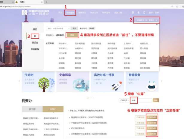 在“一网通办”登录成功后,点击“切换部门、区、管委会”,选择所在区(不需要选择社区街镇),直接点击“前往”,进入本区事项选择界面。
