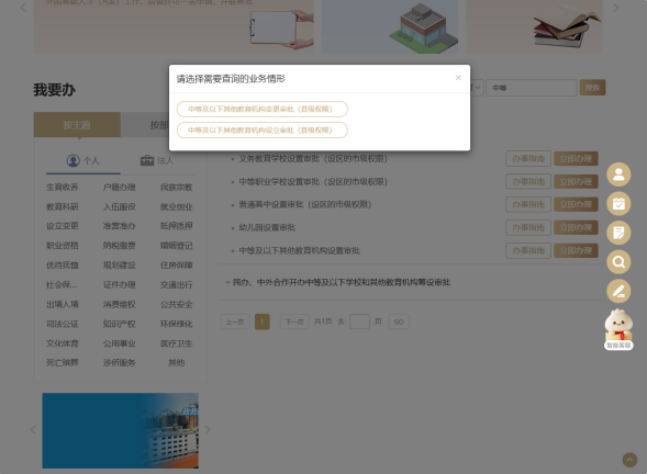 选中“行政许可”,在搜索框中输入“中等”,点击“搜索”按钮,搜索到“中等及以下学校和其他教育机构设置审批”事项,点击此事项名称,展开子事项名称,培训机构可点击“中等及以下其他教育机构设置审批”后面的“立即办理”。