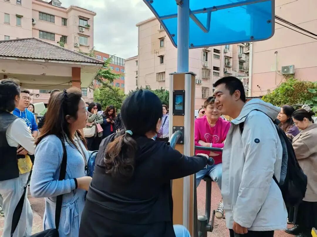下午的培训则将课堂移至户外,学员们前往翔殷路491弄居民区的健身苑点进行现场实操。
