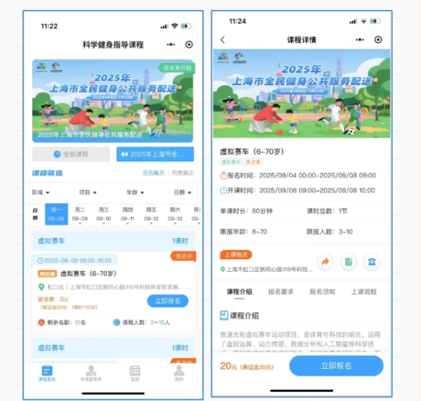 点击小程序链接进入“上海社会体育指导员”微信小程序,即可直接进入活动链接,选择开课日期查看课程安排,点击“报名”按钮查看课程详细信息,添加选择学员信息,支付保证金完成报名(为确保授课质量,此次报名每次课程每课时收取20元保证金,提前24小时,部分课程提前12小时取消报名或完成上课打卡即可退还)。