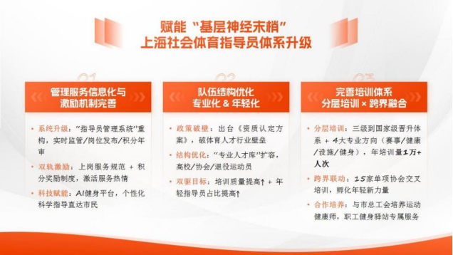 从“一个人”到“一张网”,市体育局通过科学化管理、专业化培训和体系化服务这三张王牌,将6万名指导员凝聚成一股强大的力量。这些看似无形的举措,实则构成了上海“全民健身”战略的坚实底座。