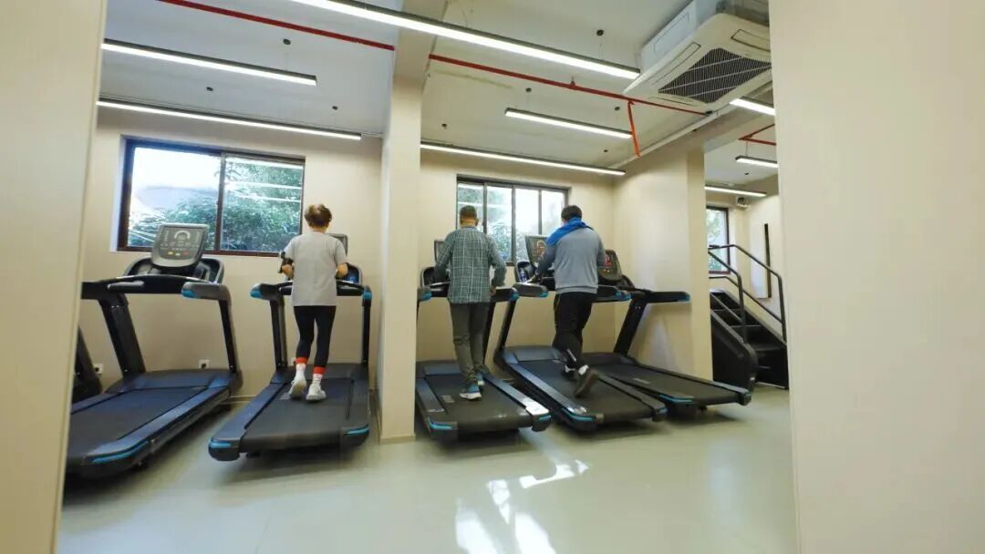 沈仁杰熟悉这里的每一个器材,前些年,他出于对体育锻炼的喜爱去考了健身教练证,虽然没有从事这份工作,但把知识运用在了生活的方方面面。“今天打算跑多长时间啊?”沈仁杰向一位居民打招呼,对不常锻炼的上班族或年纪稍长的老年人来说,跑步机无疑是场馆最方便的器材了。近十台跑步机一字排开,数量充足,任何时候无需等待就能开跑。屏幕实时显示心率、能量消耗,既能锻炼身体,又可以让身体负担不至于过重。