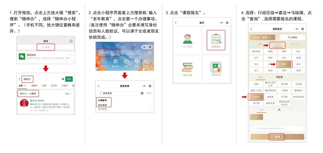 报名方式:打开“随申办”小程序或者“随申办”APP→“随申办”上方搜索框点击“搜一搜”→输入“老年教育”→点击“课程报名”→行政区级→嘉定→马陆镇→查询→选择课程→报名
