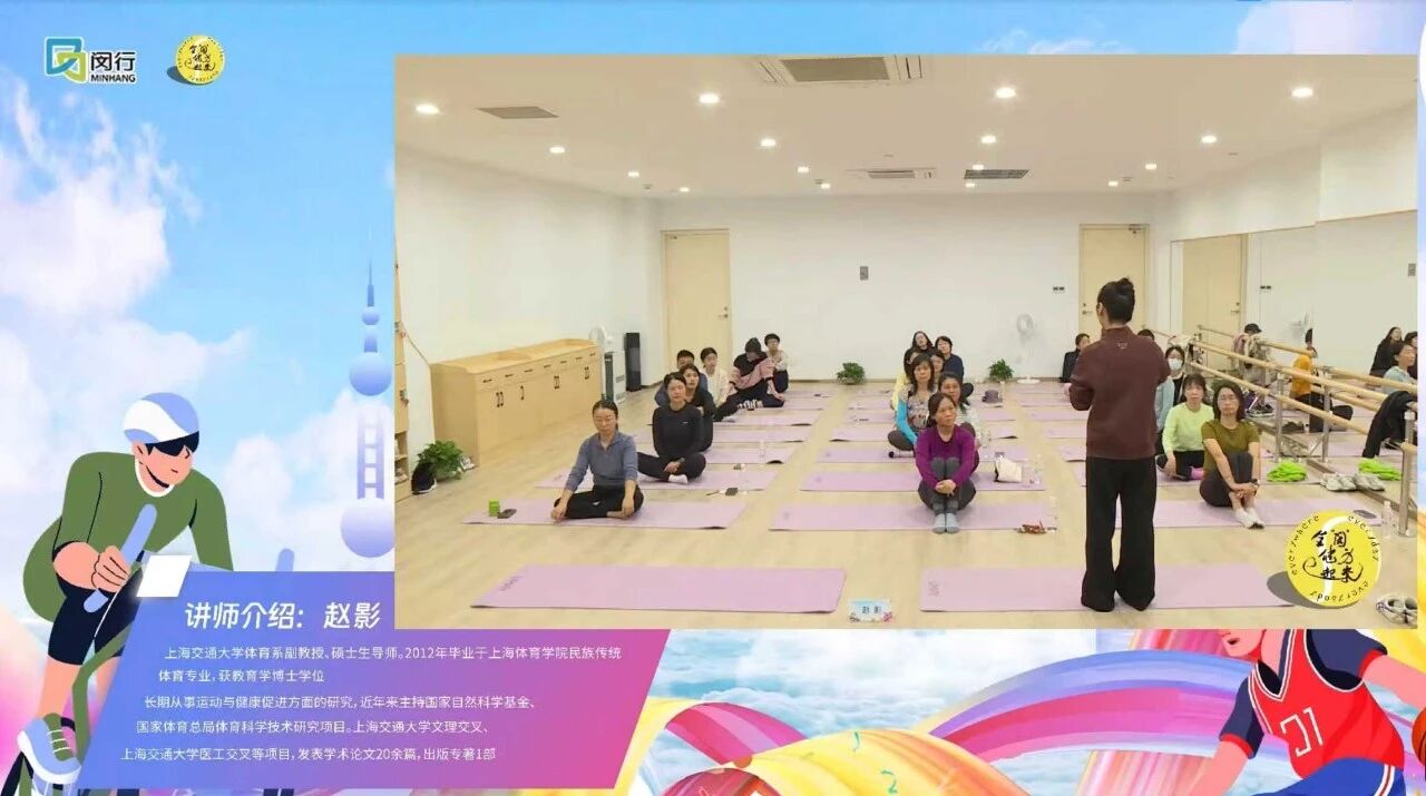 日前,全“闵”健身e起来科学健身系列活动《微运动与冥想呼吸放松》在古美文体生活馆举行,本次活动特邀上海交通大学体育系副教授赵影授课,通过线上直播和线下参与的形式,与大家分享利用碎片化时间进行微运动,缓解压力、放松身心的方式,开启一场身心疗愈之旅。