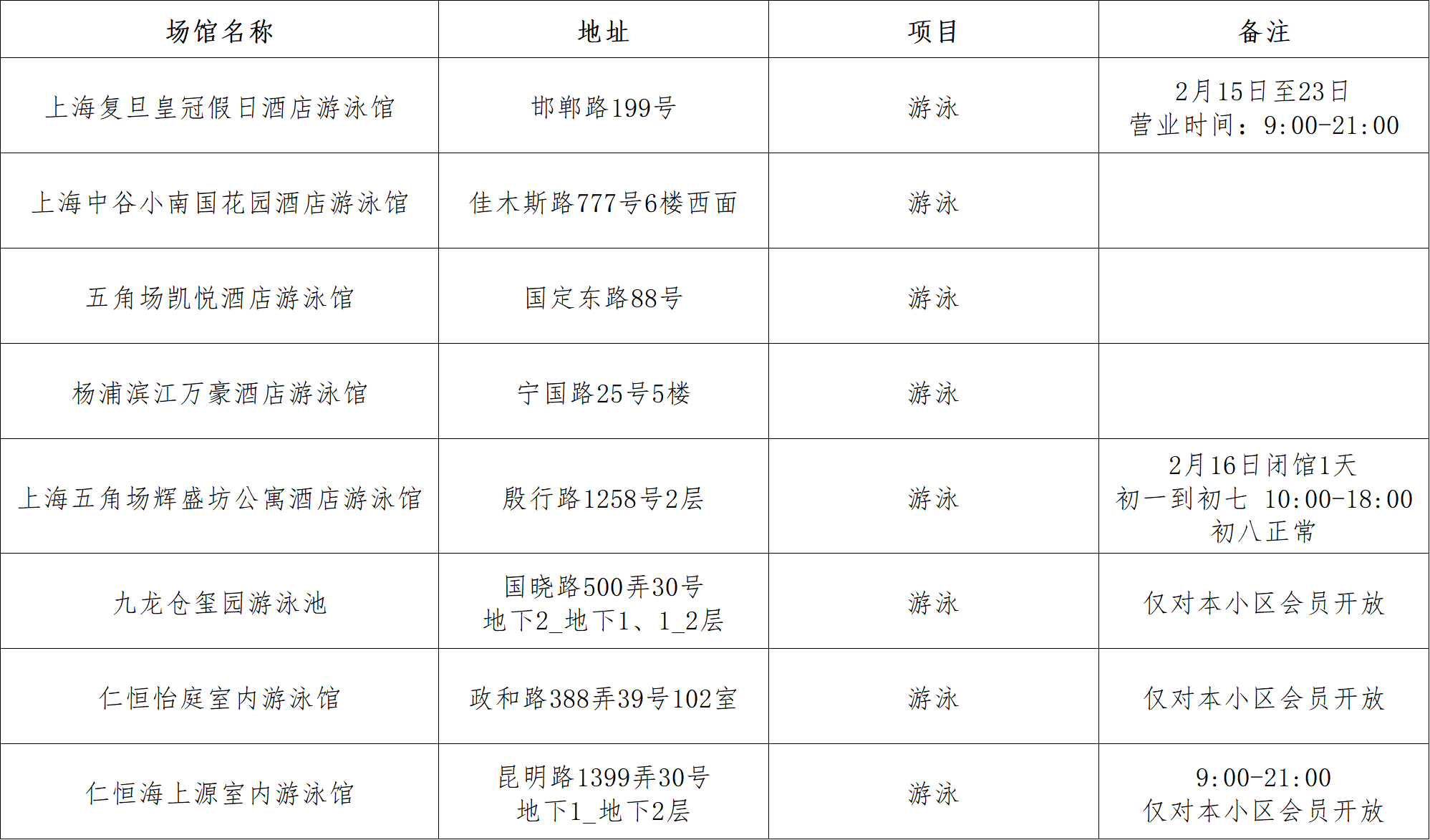 游泳场馆开放信息一览