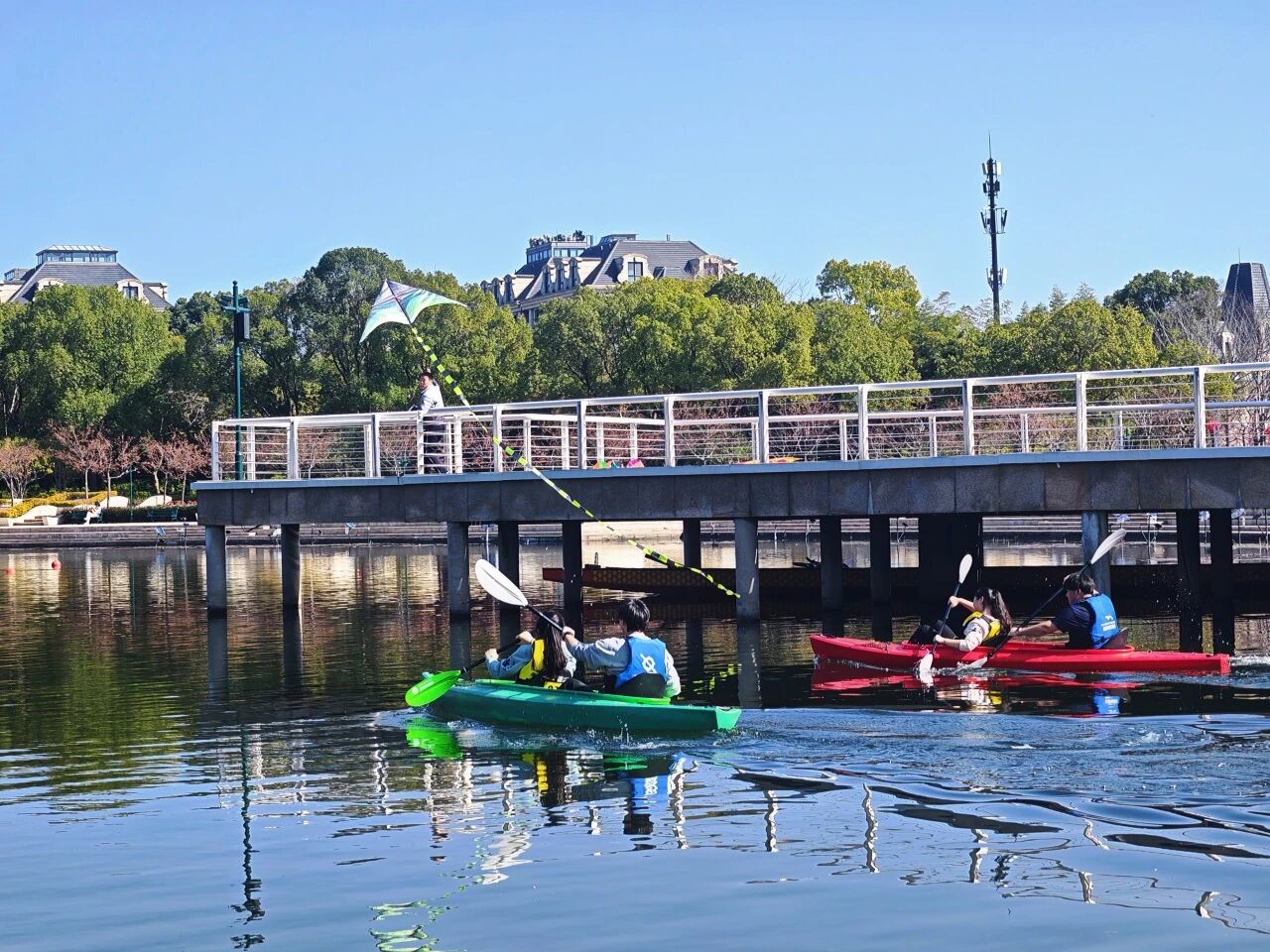 碧波划行,荡漾新春生机。活动现场,在专业教练的悉心指导下,市民们有序登船。随着船桨轻摇,一艘艘皮划艇在公园的清澈水面上悠然穿行,激起阵阵涟漪,为新春佳节增添了动感与活力。