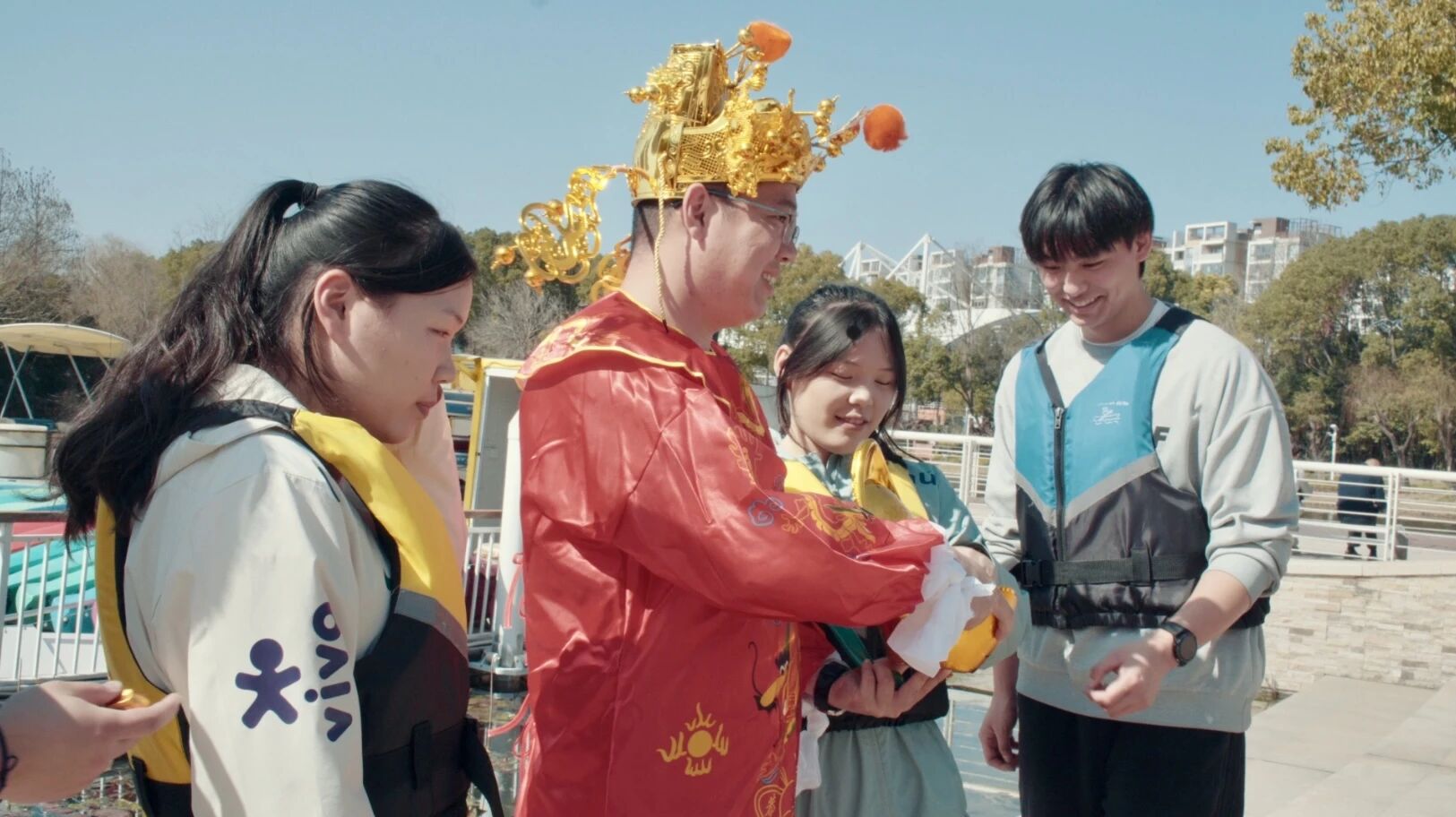 水岸互动,定格欢笑瞬间。视线转向岸边,身着红袍、喜气盈盈的“财神”正沿着亲水步道巡游,为市民派发象征财富与吉祥的“金元宝”巧克力。孩子们欢呼雀跃,家长们也纷纷拿出手机记录下这福气满满的瞬间。一位带教参与的家长表示:“这种结合水景‘迎财神’的形式非常有创意,让孩子在寓教于乐中感受到了传统文化的魅力。”