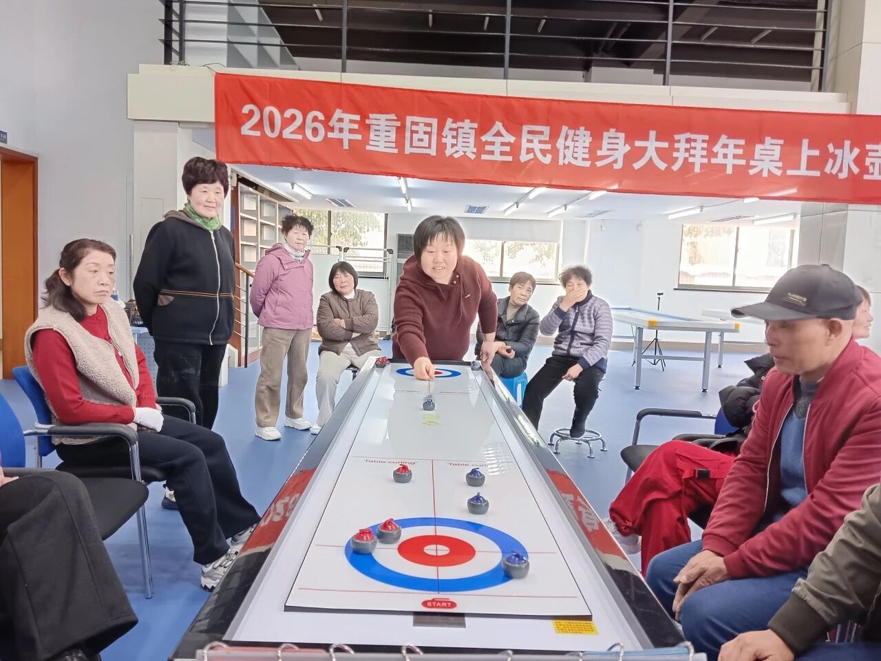 “2026年重固镇全民健身大拜年桌上冰壶交流赛”在社区文化活动中心举行,本次活动以桌上冰壶运动为纽带,吸引了全镇各村居桌上冰壶爱好者踊跃参赛,共同以运动之名传递新春祝福,展现健康活力。