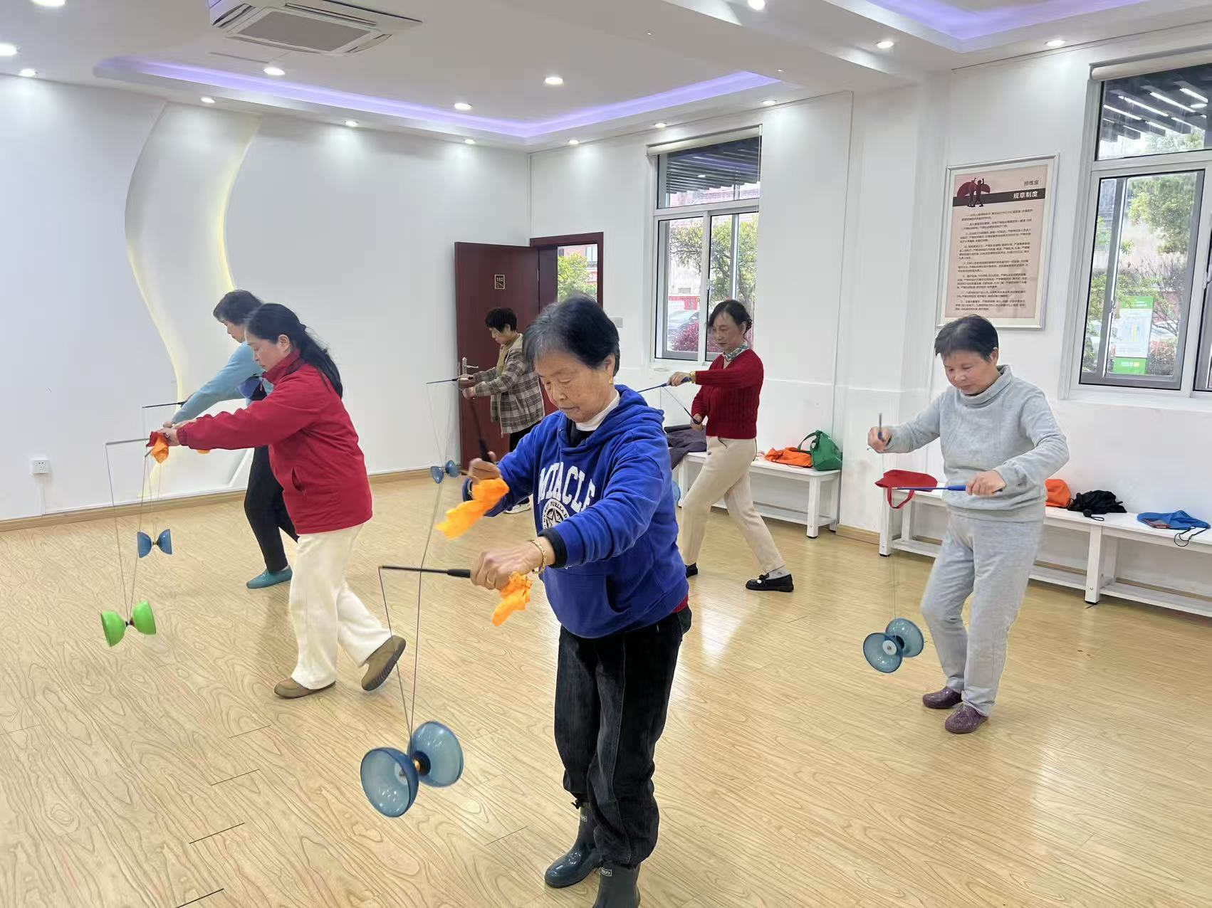 清晨的胡桥社区活动室,晨光温煦,与往常舒缓的音乐不同,今天活动室里响起的是一阵阵清脆悦耳的空竹嗡鸣声。阿姨们手持抖杆,跟随教练的口令有序列队,在轻快的节奏中,开启了一场手眼身法协同并进的空竹学习之旅。