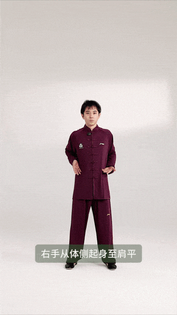 一手从体侧平举,与肩同高。注意手型变成“龙爪”——中指在最上方,食指无名指居中,小指大拇指在最下方。五指用力张开,意在刺激肝经。