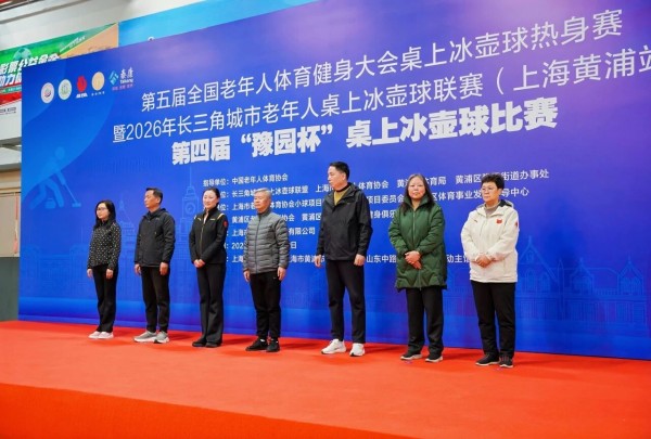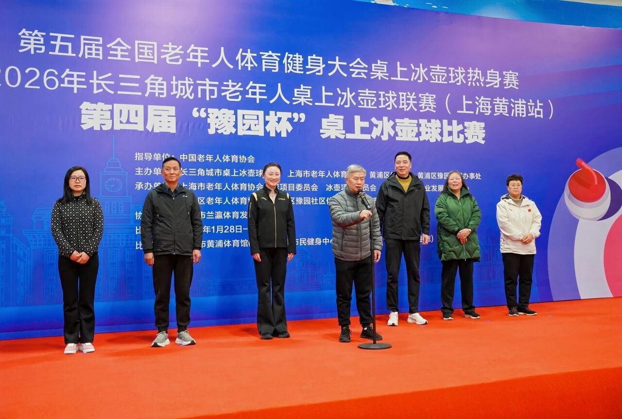 近日,第五届全国老年人体育健身大会桌上冰壶球热身赛暨2026年长三角城市老年人桌上冰壶球联赛(上海黄浦站)第四届“豫园杯”桌上冰壶球比赛在黄浦体育馆正式拉开帷幕。上海市老年人体育协会常务副会长袁辽新,黄浦区体育局党组书记沈云,黄浦区老年人体育协会会长黄建荣,黄浦区豫园街道办事处副主任刘晶晶等领导嘉宾出席开幕式,来自沪苏浙皖黔赣的老体协代表、参赛运动员、裁判员及相关单位部门代表共同参与此次活动。