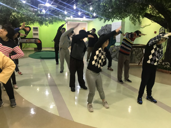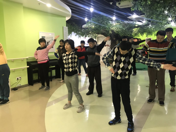 活动伊始,俱乐部教练便早早抵达现场,热情地与学员们相互问候。考虑到阳光之家学员们不同的身体状况与运动能力,教练精心量身打造了一套适配性极强的康复舒展操。这套操节奏舒缓、动作简单安全且易于学习,不含复杂高难度动作:颈部拉伸能有效放松颈部肌肉,肩部环绕可缓解肩部紧张,手臂伸展能活动手臂关节与肌肉,腰背放松能减轻腰背部压力与疲劳,下肢舒展则能对腿部等下肢部位进行有效锻炼与舒展——这些核心动作全方位照顾到了学员身体的各个部分。